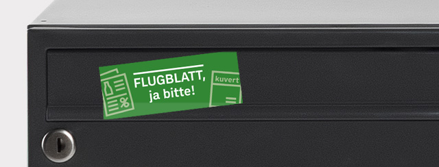 Bestellen Sie jetzt den kostenlosen Flugblatt-Sticker, überkleben Sie damit den "Bitte keine Werbung"-Aufkleber auf Ihrem Postkasten und schon erhalten Sie regelmäßig "Das Kuvert", die Flugblätter mit den besten Aktionen und Sonderangeboten sowie alle unadressierten Werbesendungen wie z.B. Flyer.