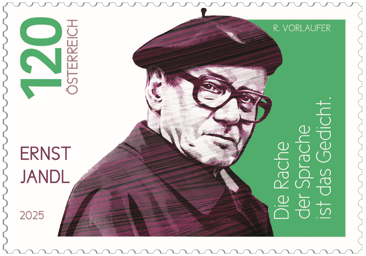 Mit der Briefmarkenserie „Literatur aus Österreich“ würdigt die Österreichische Post heimische Literat*innen unterschiedlichster Textgattungen. Die diesjährige Ausgabe ist dem Lyriker, Schriftsteller und Sprachkünstler Ernst Jandl gewidmet, der heuer 100 Jahre alt geworden wäre. Der nachfolgende Pressetext wurde mit Hilfe von KI ganz im Stile Ernst Jandls formuliert: